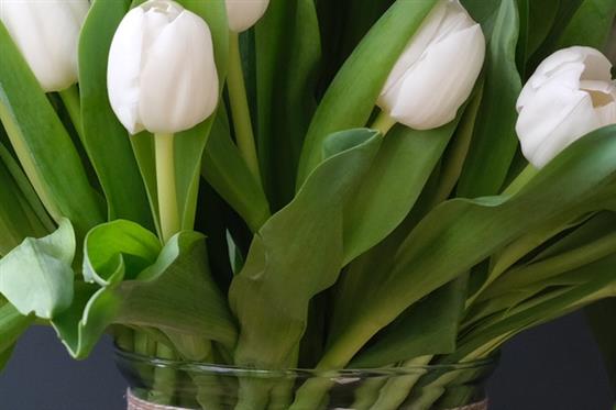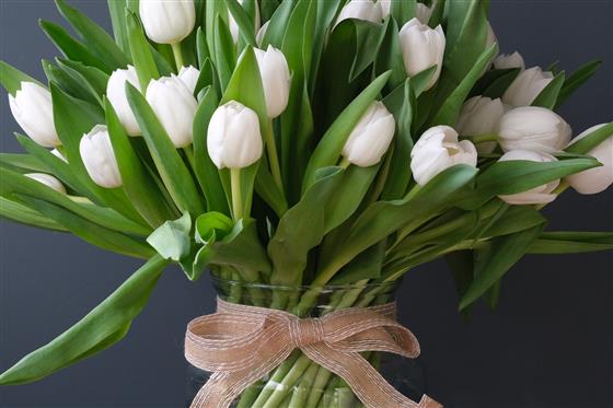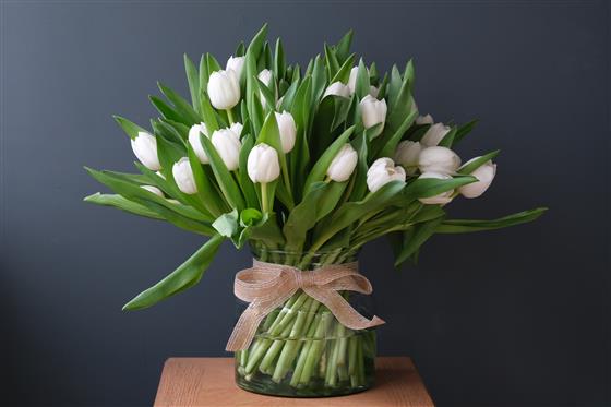 50 stems of British grown Tulips, presented in an recycled Eco glass vase.