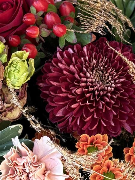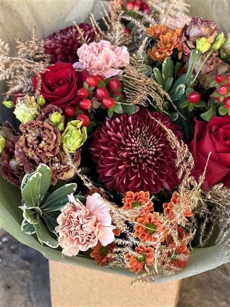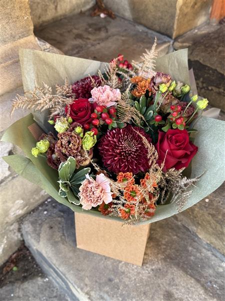 The gingerbread bouquet features all the colours you’d expect from a traditional gingerbread treat.. oranges, reds and gold festive foliage