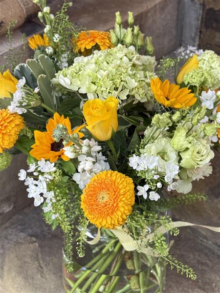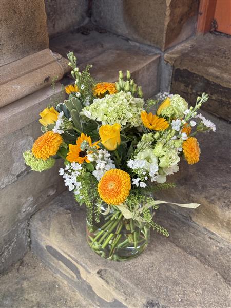 Happy, yellow spring time colours are pre-arranged in a large apothecary style glass vase