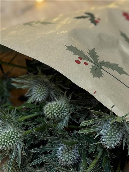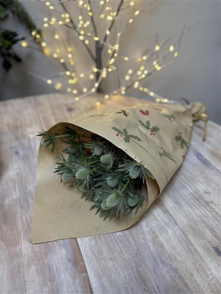 5 stems of White Eryngium simply wrapped ready for you to add to your festive arrangements or display on their own in a vase.